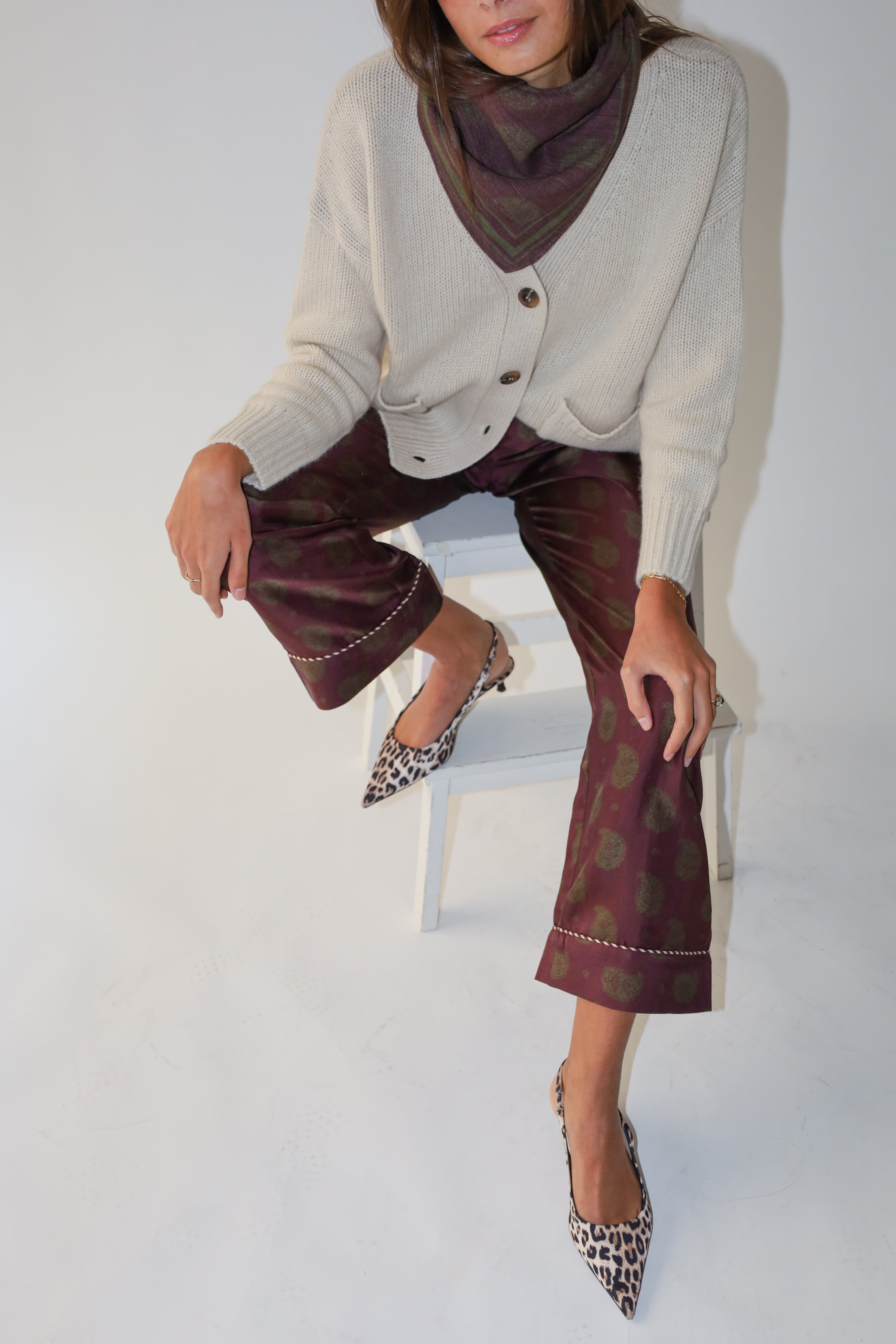 Pantalon Ramatuelle en soie Paisley Bronze fond Bordeaux