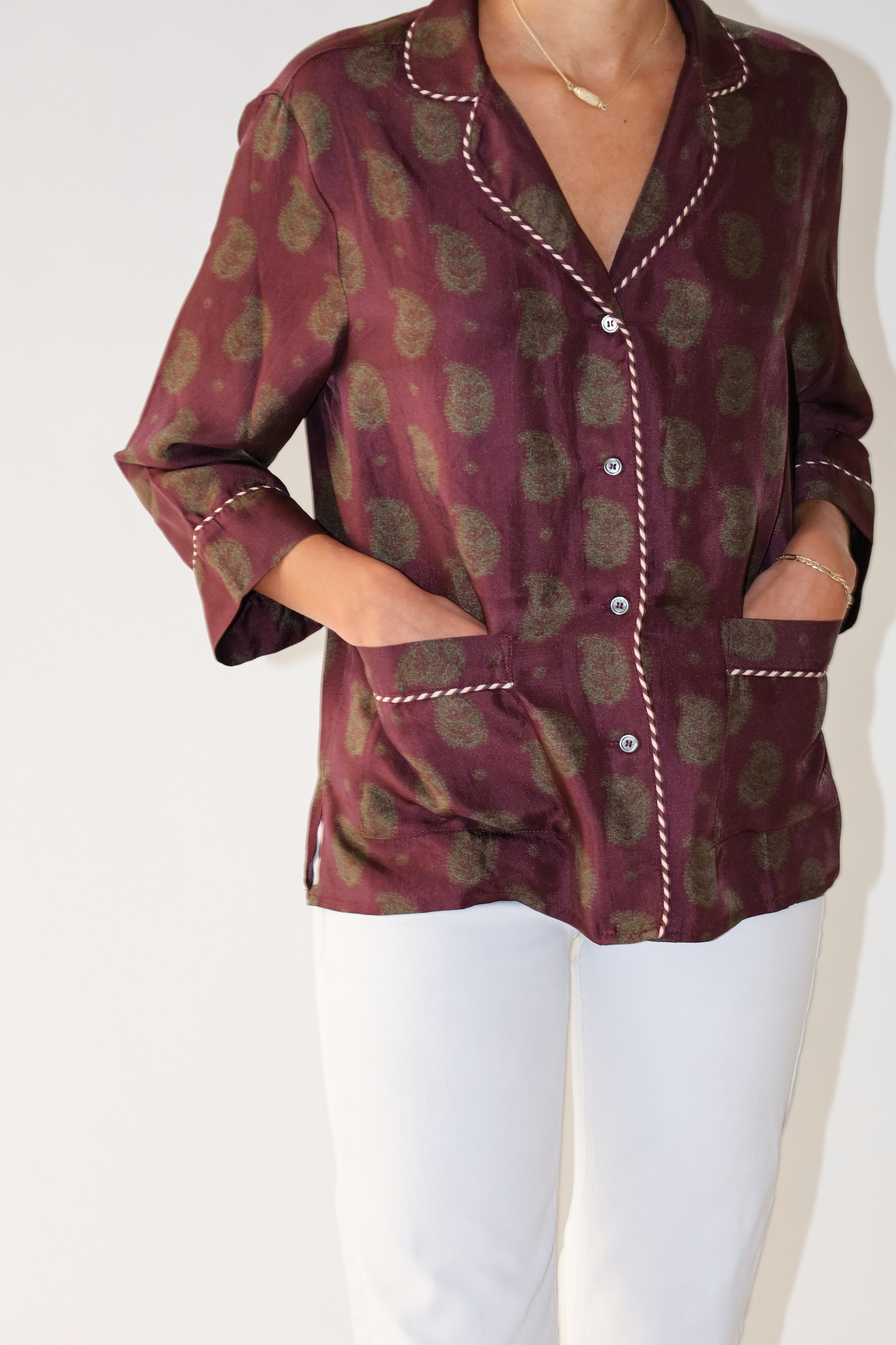 Veste Ramatuelle en soie Paisley Bronze Fond Bordeaux