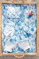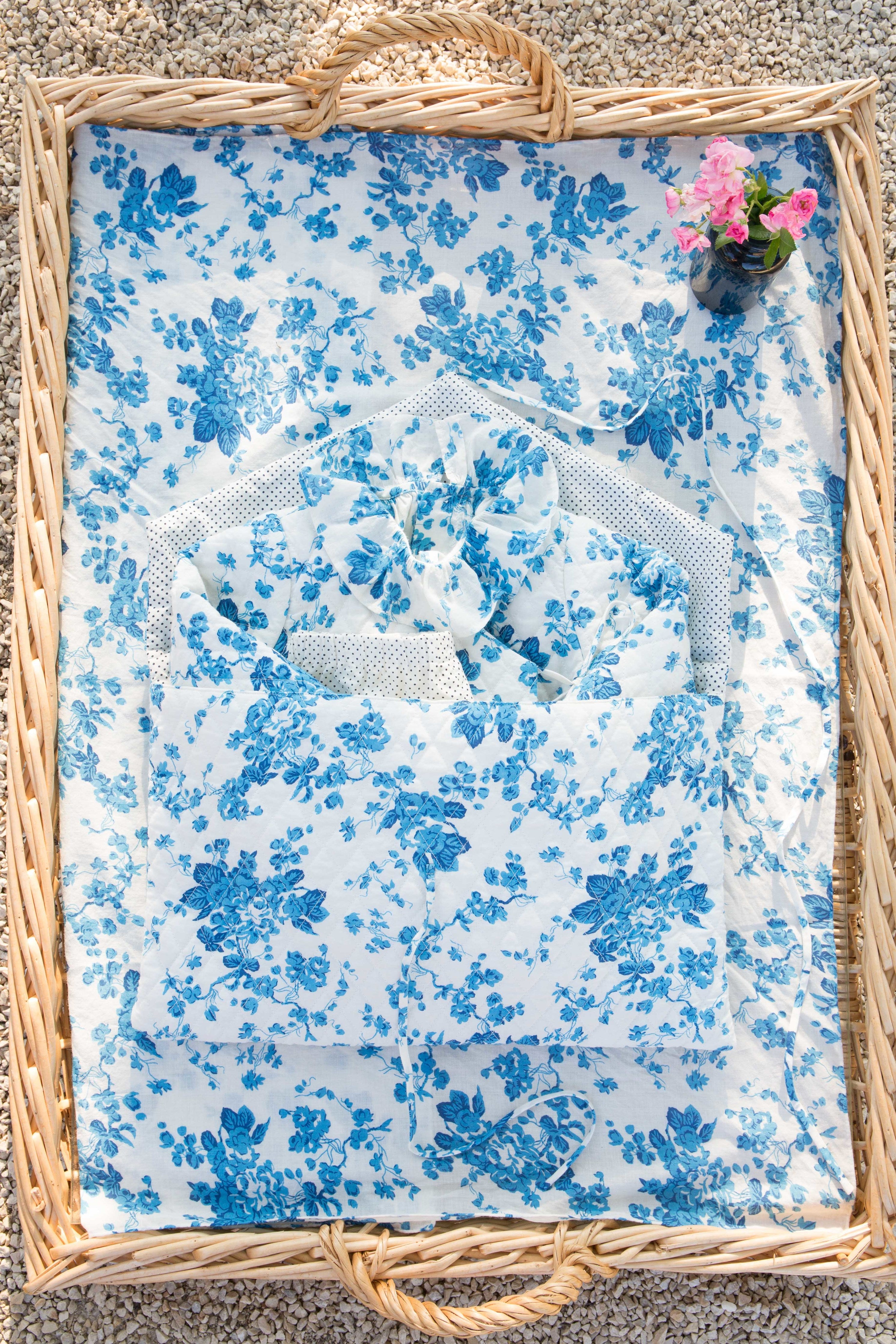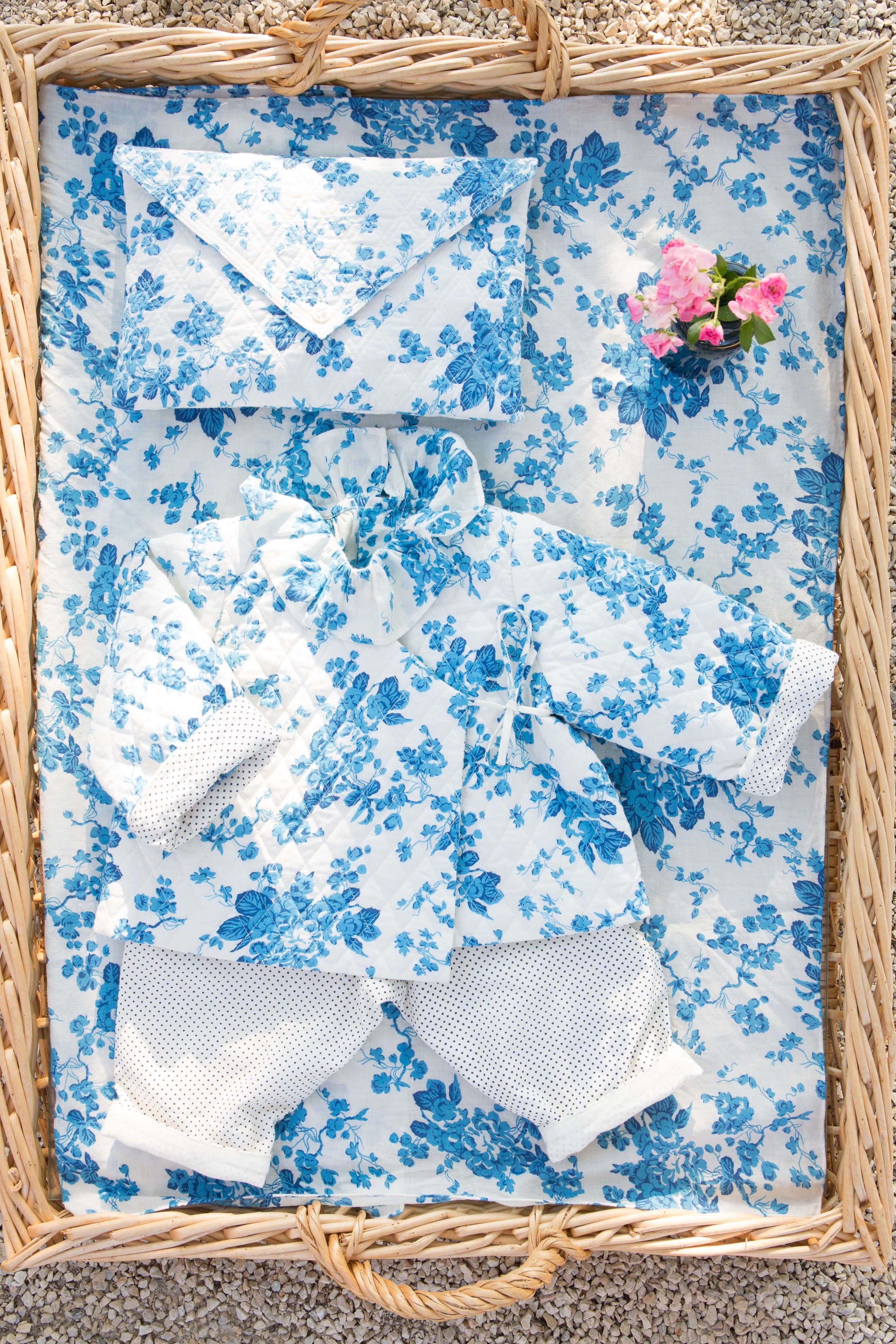 - The baby set contains: a quilted cotton pouch, a quilted cotton kimono jacket, cotton voile pants, a cotton voile blouse