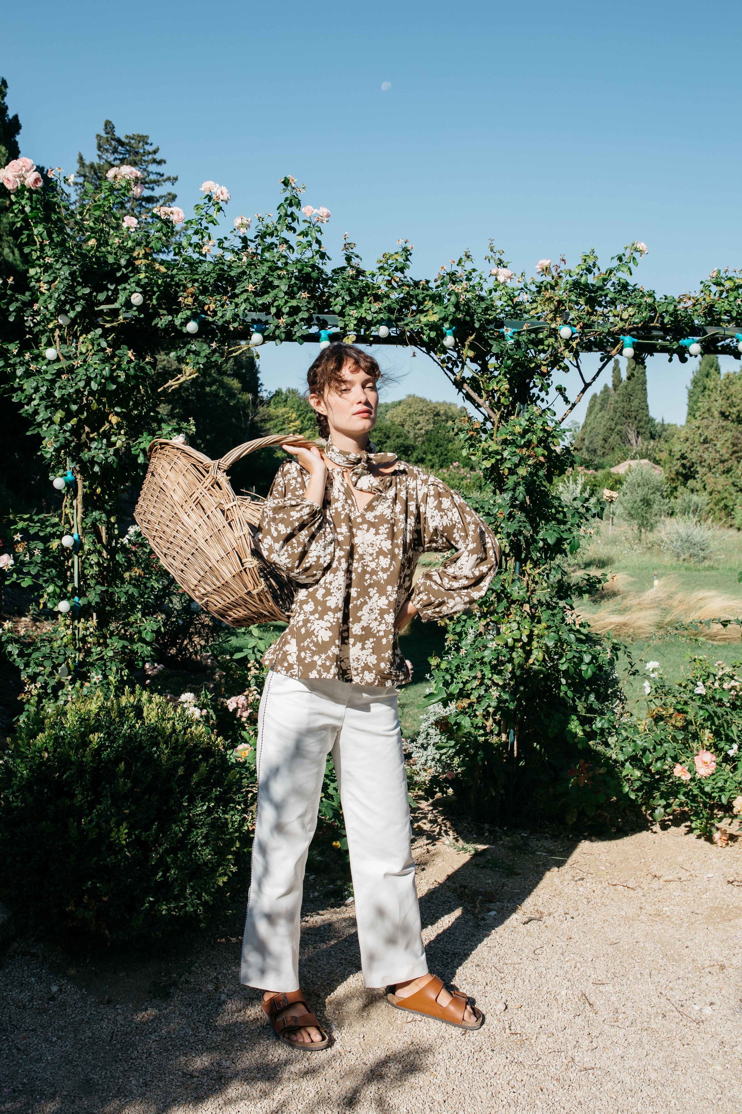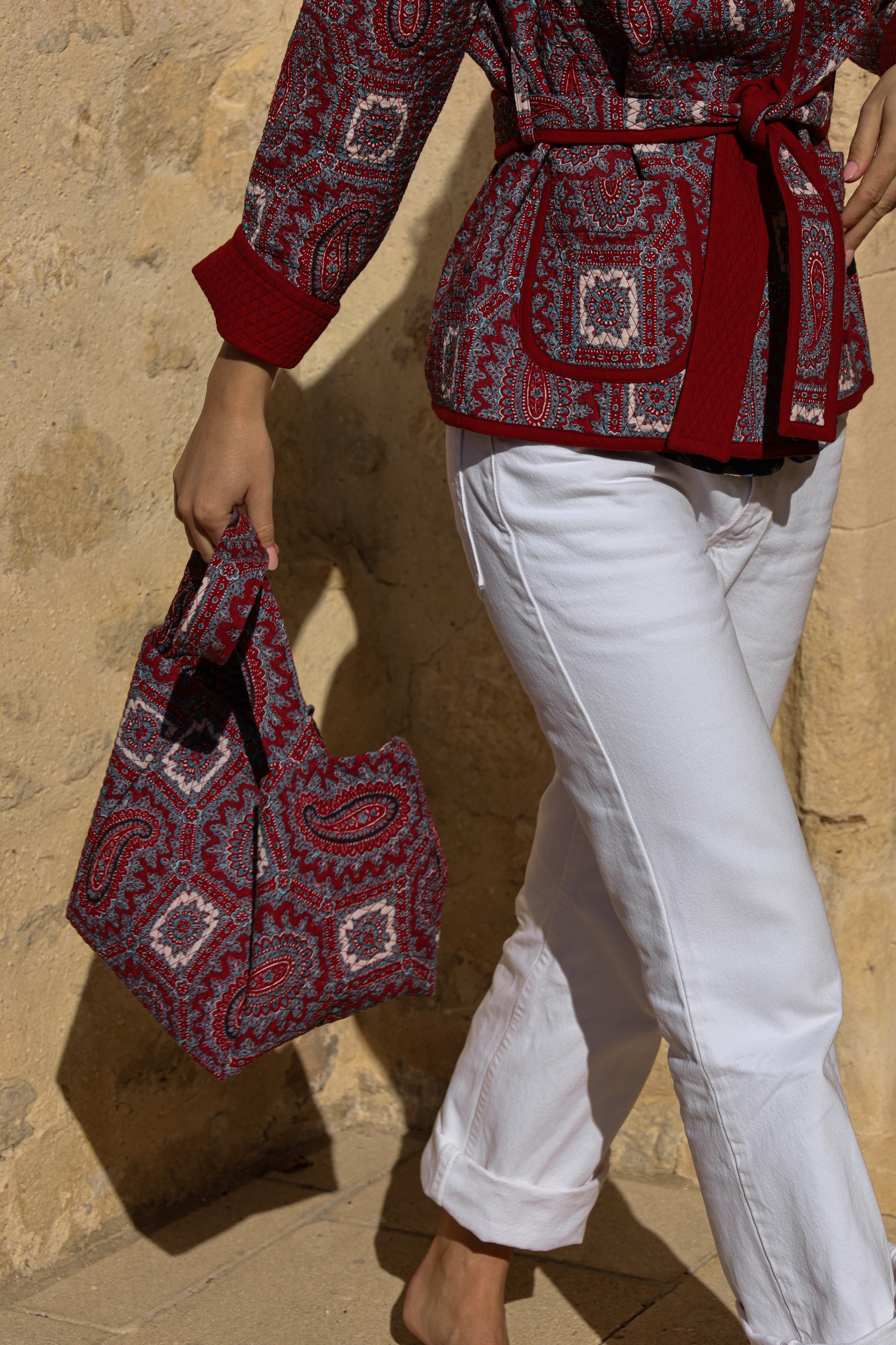 Ramatuelle silk trousers in Paisley Bronze with a Bordeaux background