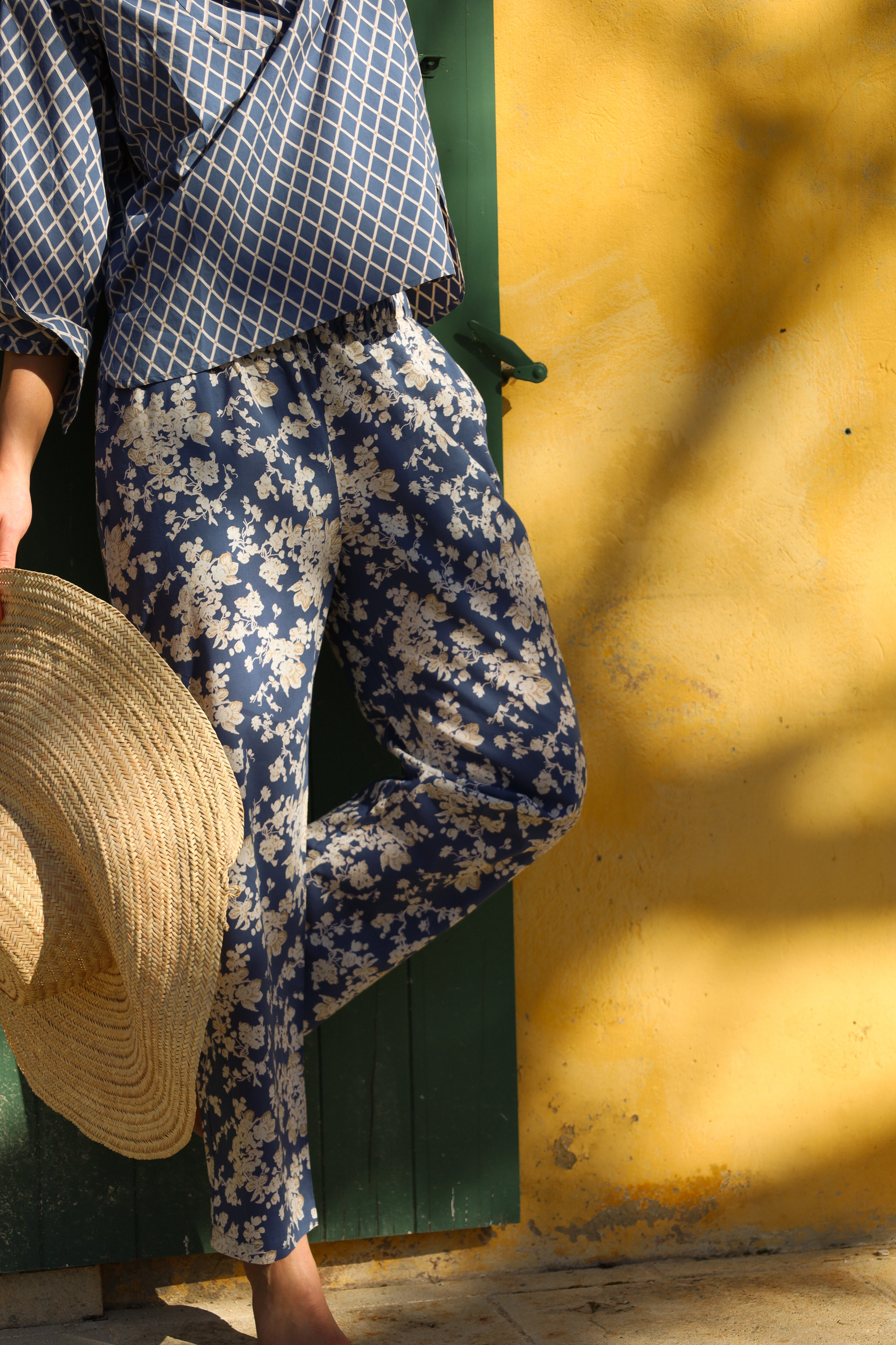 Blue Bouquet & Blue Stripe Silk Pajama Pants