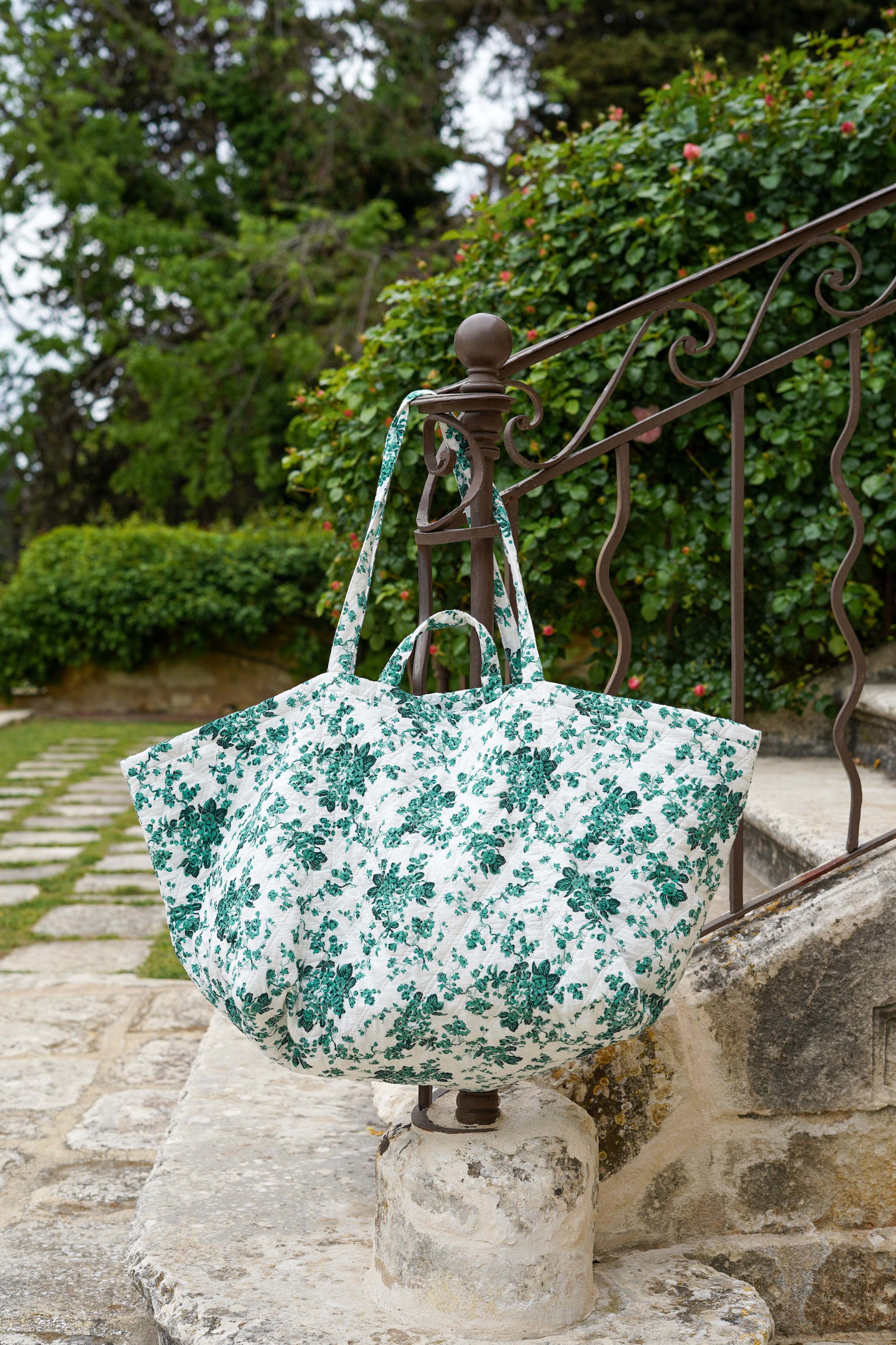 Large quilted cotton shopping bag with olive pompom print.