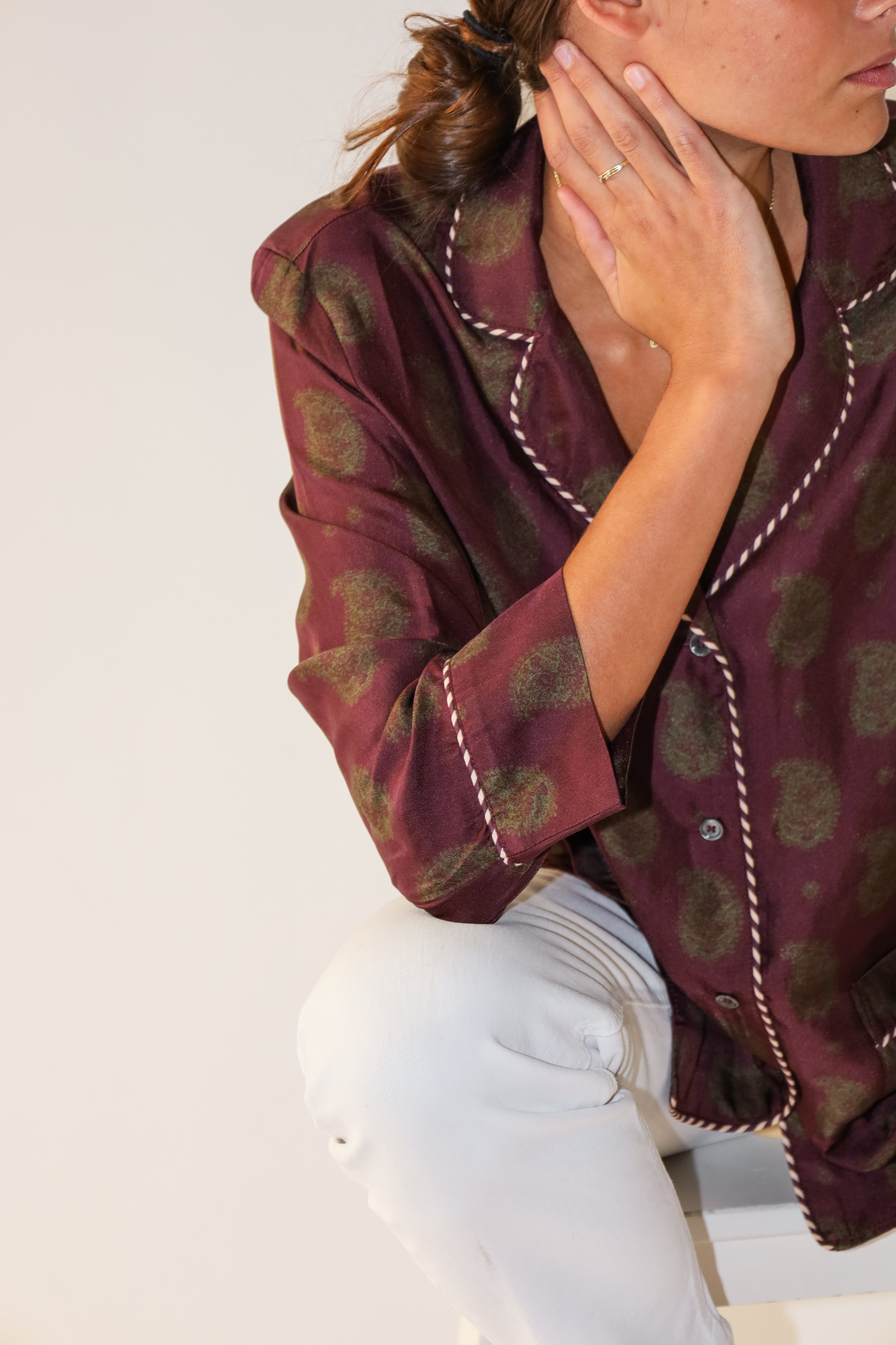 Veste Ramatuelle en soie Paisley Bronze Fond Bordeaux